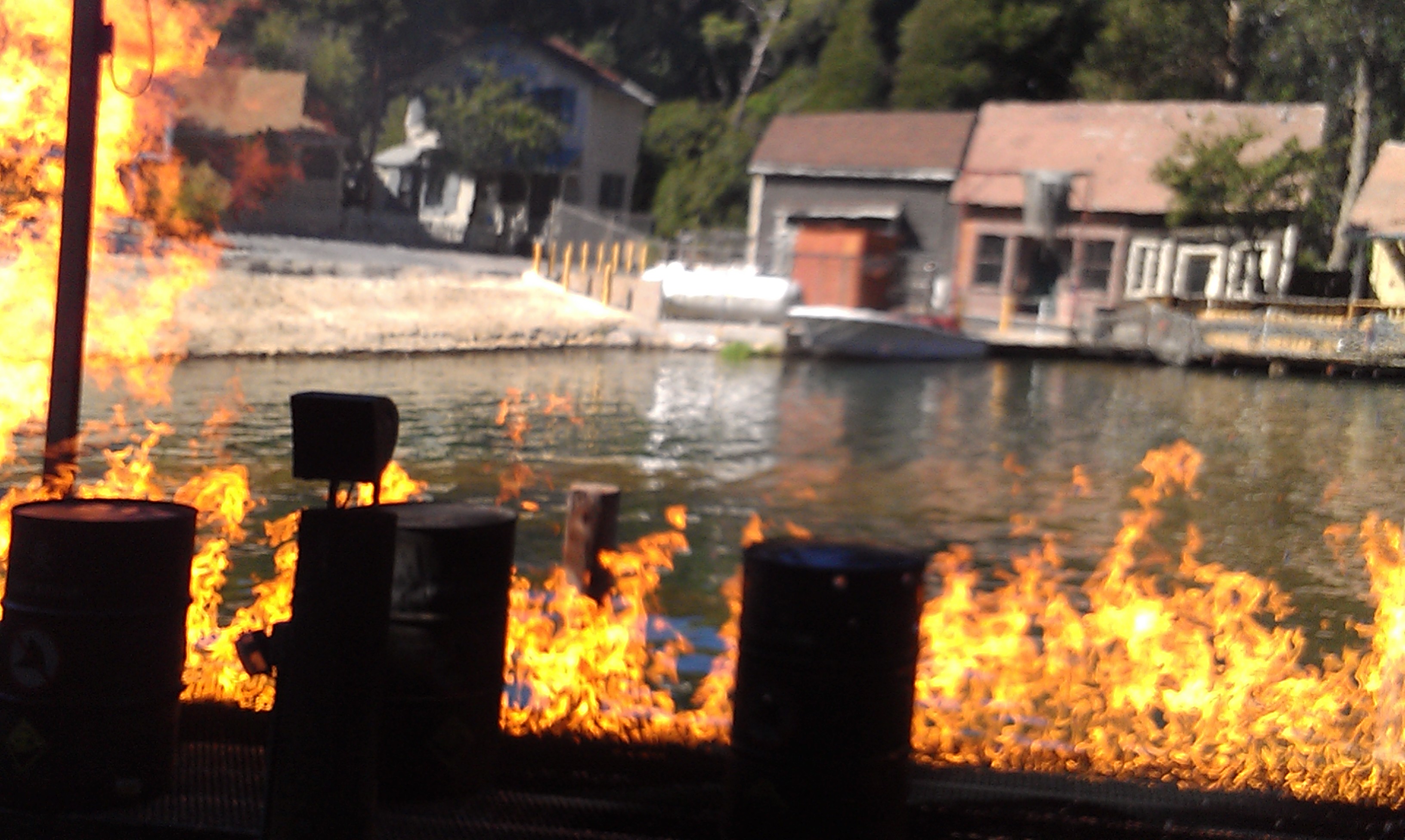 This picture illustrates very well a challenge of fire effects: the soot and charred aspect of the props. Due to the need to have a visible effect, you need to have an inefficient and dirty flame. That leave a lot of residues and in the picture above, you can see that the various props on the dock are completely black and would require either replacement or a good cleaning and repainting.