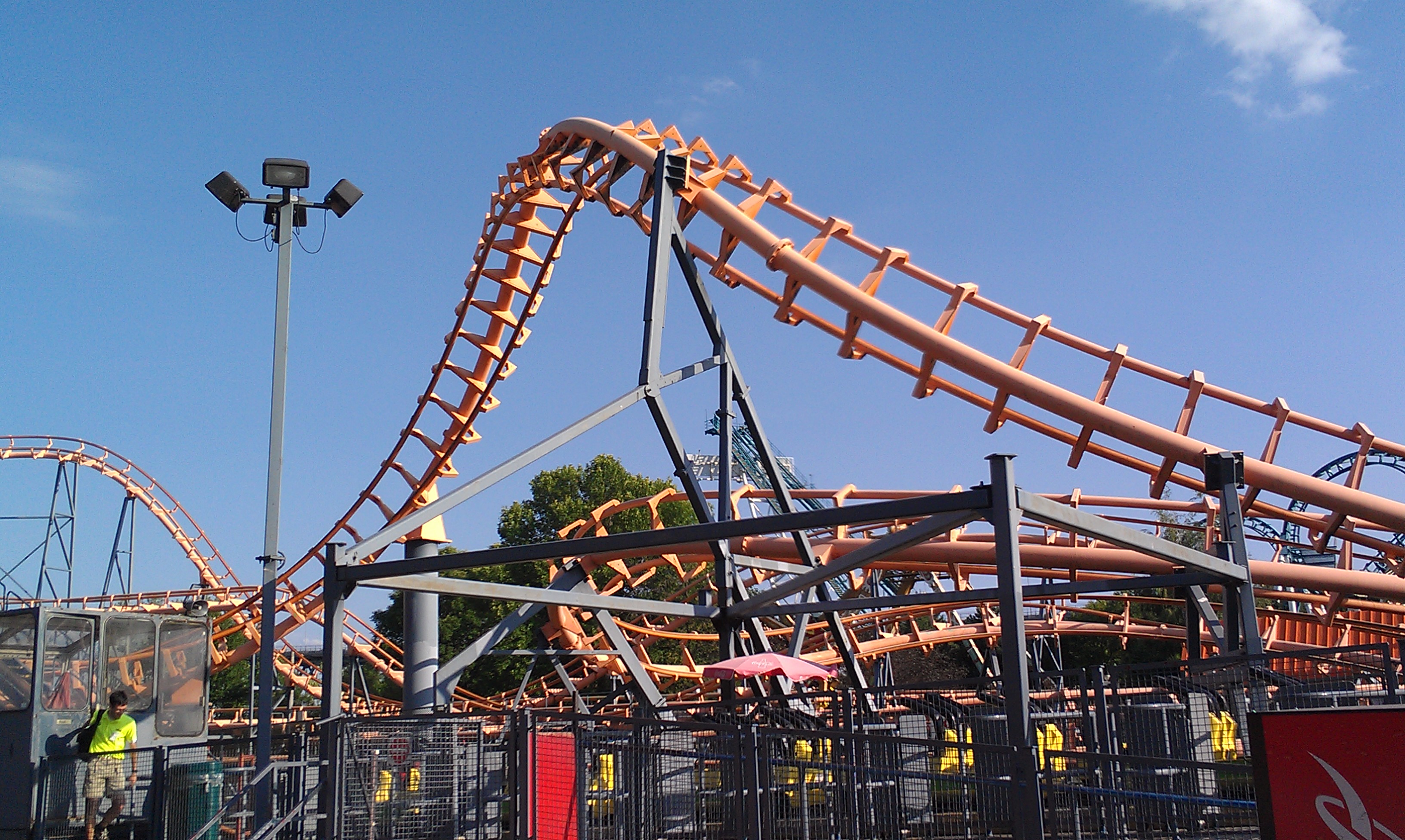 After the Corkscrew, the train rise to the right under the lift and higher turn. It turns again to the right to be parallel to the first drop. A small section of curve track can be equipped with a speed reducing trim brake, but most parks opted not to install it. Another sharp turn lead to the “Bayern Curve”, which is a convoluting 540 degrees helix. After the helix, the train go over a small hill that bring the cars under the lift hill and then the train turn to the right before rising into the brake area, which form the outer “layer” of the ride. The ride then went around a turn into the second braking area which was the holding spot for the second train.