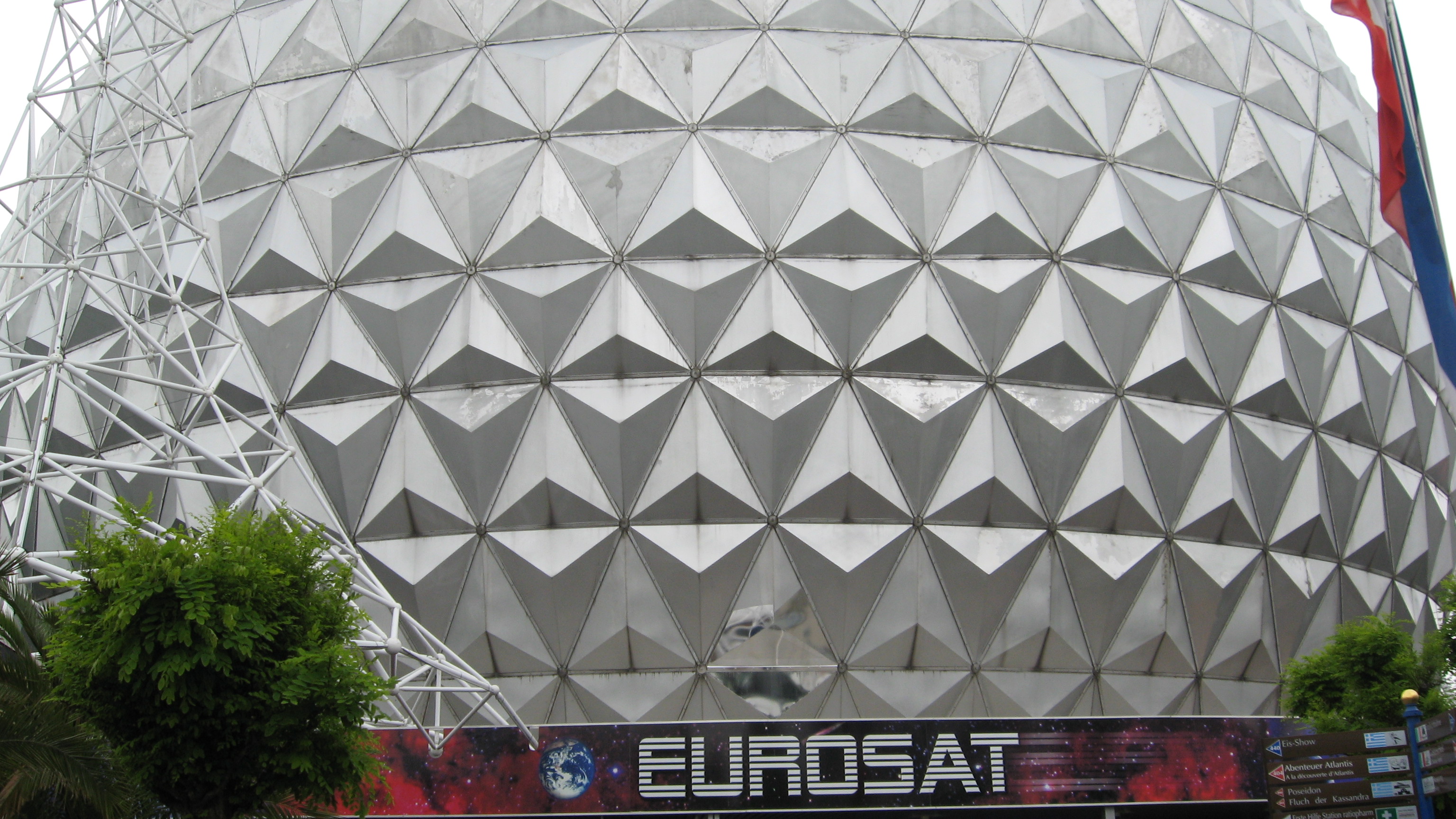 In 1989, Europa Park in Rust, Germany built a new geodesic dome in the France area of the park. Housed inside is a new style roller coaster where the spiral lift hill of the old Broadway Trip/Love Bugs/Wizard Cavern was used to take 16 passengers trains up in a compact area. The dome is 148 feet tall and the roller coaster itself is 84 feet tall inside. Most of the waiting line is in front of the silver dome under a large marquee advertising the name of the ride. Groups are periodically sent up escalators and then inside the space corridors that lead to the waiting line. You can see the large banks of computers that run the ride and the name here is efficiency. Capacity is incredible as up to 7 trains can run at a time, giving 1550 passengers per hour throughput.
