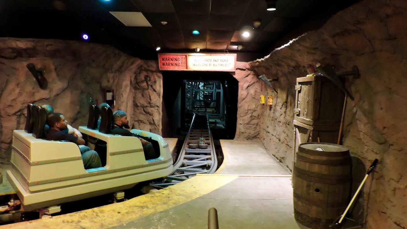 Skull Mountain opened on June 3rd 1996 at Six Flags Great Adventure (Jackson, NJ). The Rotor attraction was moved to a new location and the manmade hill built around it was levelled in preparation for the new attraction. Like in Texas, a 65 feet tall soundstage was constructed, but the ride’s theme and ride hardware were drastically different. Whereas Premier Rides was selected for Texas, Intamin AG was chosen for the New Jersey mountain. A brand new ride system based on the Indoor Family Coaster seen at La Ronde and Las Vegas was designed where each car now has two rows of two riders and one lap bar per row to secure riders. Three trains originally ran on it and gave exceptional capacity with 28 riders per train. To save on construction costs, the transfer track is built outside the soundstage and a rolling garage door prevents light intrusion when trains are not being moved in and out.