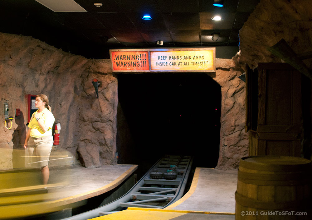 The whole area around the ride was renovated to fit in with the new ride, which appears to be a mountain that just came out of the swamp. The waiting line goes around the swamp before going inside the mysterious mine shafts. Along the way, “Gator Mcgee” appears to be the owner and gives riders boarding instruction.