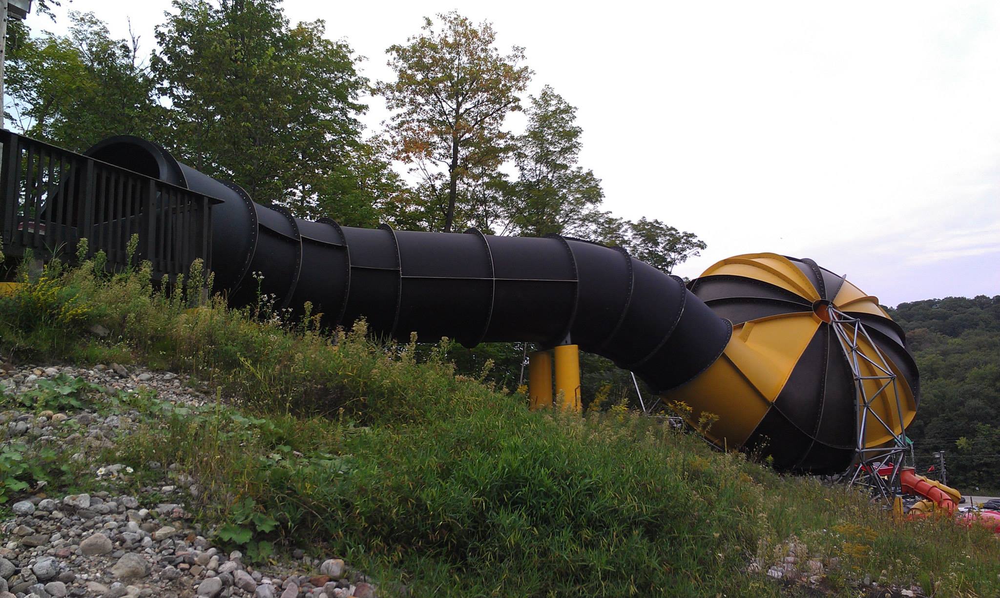 The same year, Proslide decided to spice things up at Mont Cascade (Cantley, QC). Mont Cascade has been owned since 1992 by Proslide and is used to showcase some of the products. It was originally just a skiing mountain, but slides were added to the mountain side closest to the skiing chalet. Around 1996-1997, They introduced a Dark Mammoth, which was an example of the fully enclosed Family Raft slide that was pioneered by them. So, they modified the start of the Dark Mammoth by re profiling and adding a prototype funnel. It is only 24 feet tall and thus pack quite a punch in a small area! It is also enclosed except for a small light hole and the result is fantastic. You still have the long original slide and the intense Tantrum funnel at the start. The slide at Mont Cascade was renamed the Tornado Alley; thus, a product line was launched and was called until 2013 the “Tantrum”. That year, all funnel models were consolidated into the Tornado line and differentiated by their size. The Tantrum became the Tornado 24