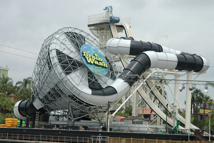 In 2008, Wet n Wild (Orlando, FL) introduced Brain Wash, an enclosed Tornado 45. Notice the extended post funnel flume. Picture appears courtesy of www.proslide.com.