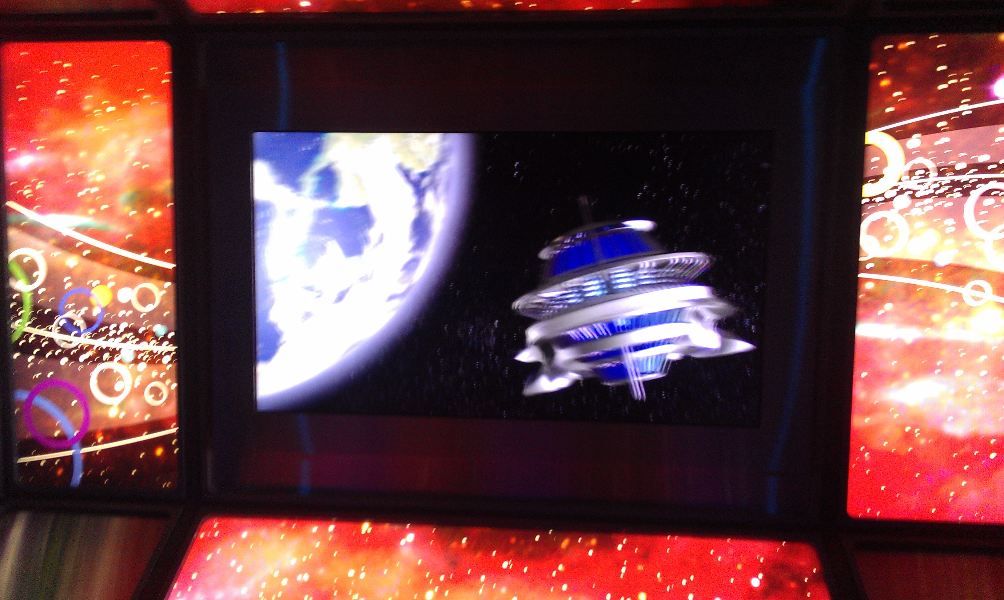 In late 2006, the ride closed down to be modernized. The ride system was refurbed and a new fleet of rockets were introduced. The ride logo and overall look was changed: it was now more of a Matrix style sci-fi for the effects and music. The stand-by waiting line is still at the bottom, while the fast pass return bypass it and allows guests to directly access the Speedramp. Once at the top, fast pass holders are sent to the left and stand-by guests sent to the right. The promotional video was replaced by an all new music video that shows off the ride new style and theme. Once inside, the windows were blocked, since to make the ride darker, the glow in the dark strips were never installed on the new rockets. Now, what is amazing is when we reach the loading area, it is exactly like in the video earlier. Same incredible starship hanging from the ceiling, incredible light effects and the air gates look like laser portals. A unique sound also signals when rockets leave the loading section. The first lift feature green lights, followed by green squares that light up as we roll the long section after. The second lift hill feature colored light beams that seem to follow us and then concentrate into a light circle at the top. The gravity portion got incredible star field effects that accentuate the feeling of speed. The last new feature is the Re Entry tunnel, where it looks as if we braked so suddenly the stars around us reversed course.