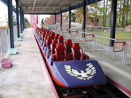 1980 saw Izumiyo Kiko Co., Ltd., the manufacturing division of Senyo Kogyo Co., Ltd., a Japanese park operator and developer, develop their style of shuttle loop.  As it was called, the Atomic Coaster had an unusual layout; the station is located higher off the ground.  From there, a pair of lift chains with pusher dogs push the train forward the lift hill.  At the top, the track levels off, still pointing upward at a very shallow angle.  It is quite similar to Meisho’s Loop The Loop, but the station at a higher point and subsequent second drop lead to a slightly slower ride.