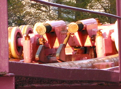 The first spike uses a dual cable catch car that attaches itself to a piece located in the front of the first car’s chassis.  Interestingly, the catch car doesn’t go to the station.  Instead, the brakes release the train, and it rolls forward into the catch car.  The catch car is spring-loaded, and when it’s tripped, it grabs the train and starts pulling it up the spike.  To minimize friction on the cables and wear and tear on the track, rubber pieces cover the track ties at the area where the cables hang above.