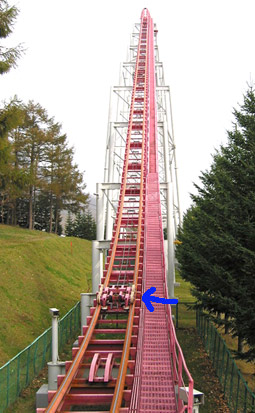 The second model, the Shuttle Loop mentioned above opened as “Loop Coaster” at Tojoko Toy Kingdom/東条湖おもちゃ王国.  Standing a massive 150.9 feet tall, this attraction’s spikes stand at each end of the layout.  We discovered this Japanese page at http://drkssk27.web.fc2.com/zekkyou/rusutsu/loopthe/loopthe.html where a detailed explanation of Rusutsu Resort Loop the Loop was found along with all the photos.