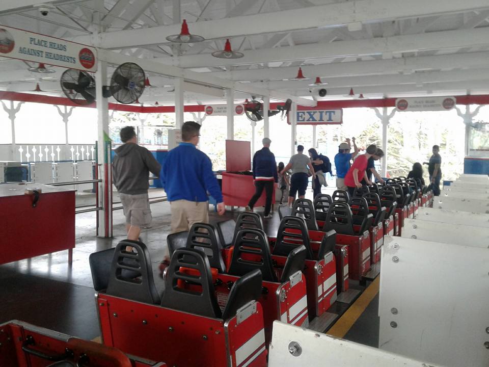 The ride was designed to run six trains from Philadelphia Toboggan Company (now PTC, Philadelphia Toboggan Coasters Inc.), with each train having five cars. We cannot find any evidence of the ride running three trains on each track, though. Each vehicle has three rows, allowing for six riders, with a handrail single position lap bar, headrests, and a seat divider securing riders in each row. This changed in the early 1990s, with the trains receiving extensive modifications.