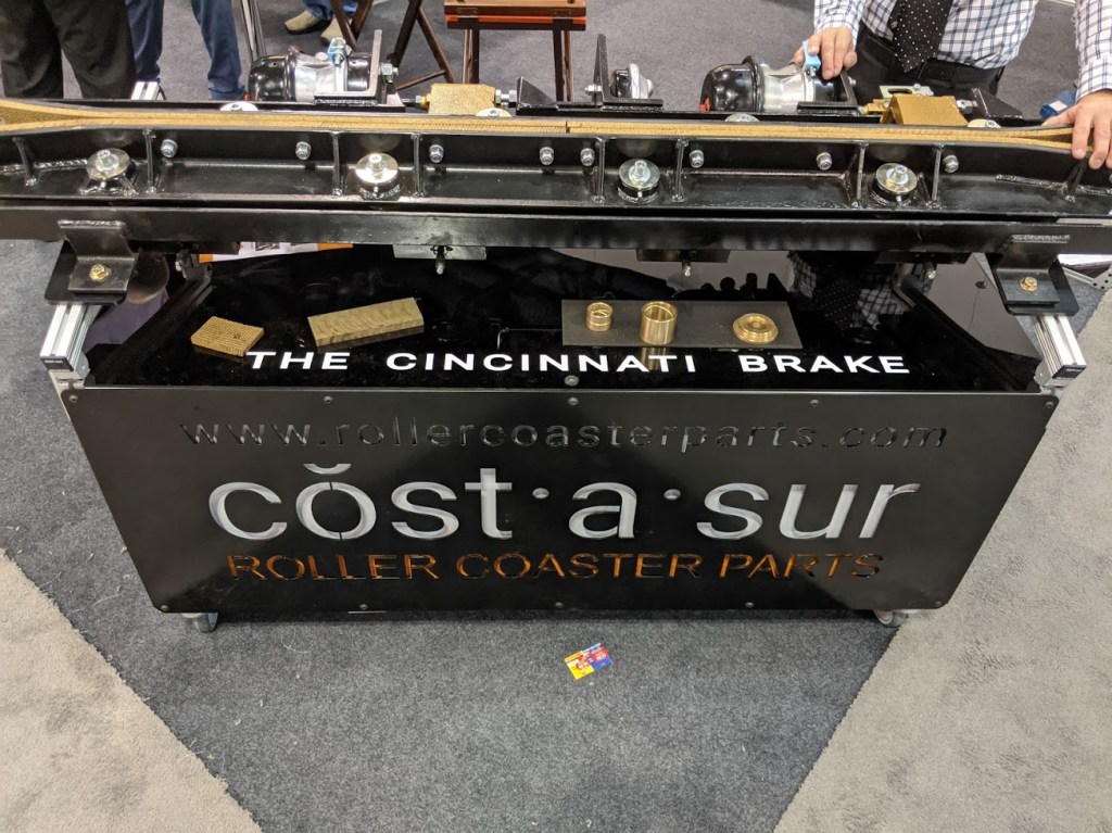 The current braking configuration is as follows: one brake caliper on each track at the end of the straight section at the top of the barrel. Both tracks were then reprofiled to receive two calipers each exiting the barrel to protect the following curves from excessive speed. Finally, to entirely stop the train if need be, three calipers were mounted on each side before the final helix.