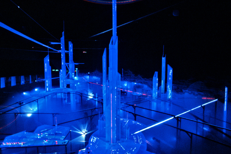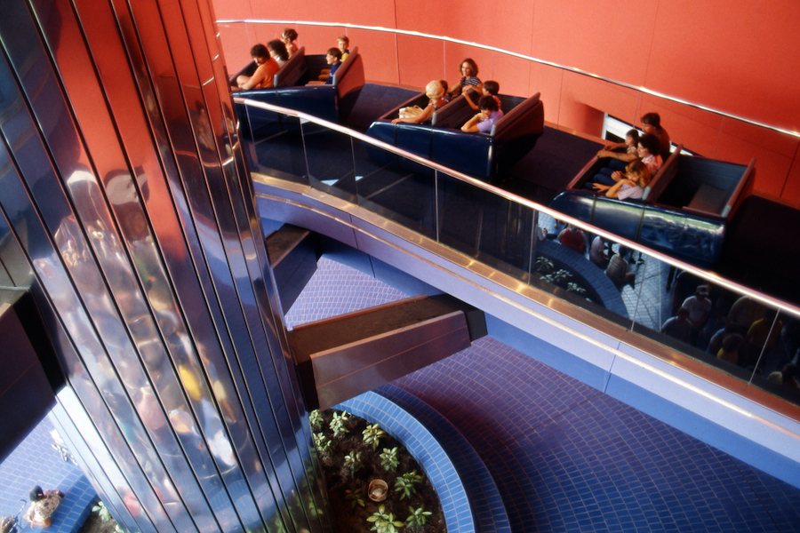 The circular building laid the basic layout that many attractions in compact spaces would be used to great success later. The bottom floor housed an indoor queue and ramp leading to the elevated load platform on the left side. After boarding, guests went back outside in a gentle spiral that enticed passers-by to try the attraction and transitioned to the next level. The upper level of the attraction is all track and show, in a winding path around the building clockwise. The center of the course was left open for the attraction finale. The finale was a spiral that gently went down, showing prototype cars and a city of the future at the bottom.