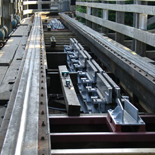 One major innovation for Velocity Magnetics is magnetic friction brakes, first introduced in 2012 on the Comet at Waldameer Park (Erie, PA). For this project, the park removed approximately 175 feet of track from the station and brake run. Velocity Magnetics then manufactured pre molded steel track that was bolted to the existing structure. The wooden running boards were bolted to the top of the running steel. Meanwhile, one car of the two PTC junior trains was sent to Velocity for modifications. The pads under the car were replaced by a new alloy that is both resistant and compatible with the rare earth magnets that will slow down the train in the 3 fixed magnetic brake sections. Then, 5 pneumatic friction brake sections will slow down the train and hold it. The load and unload has two more sections that are independently controlled.