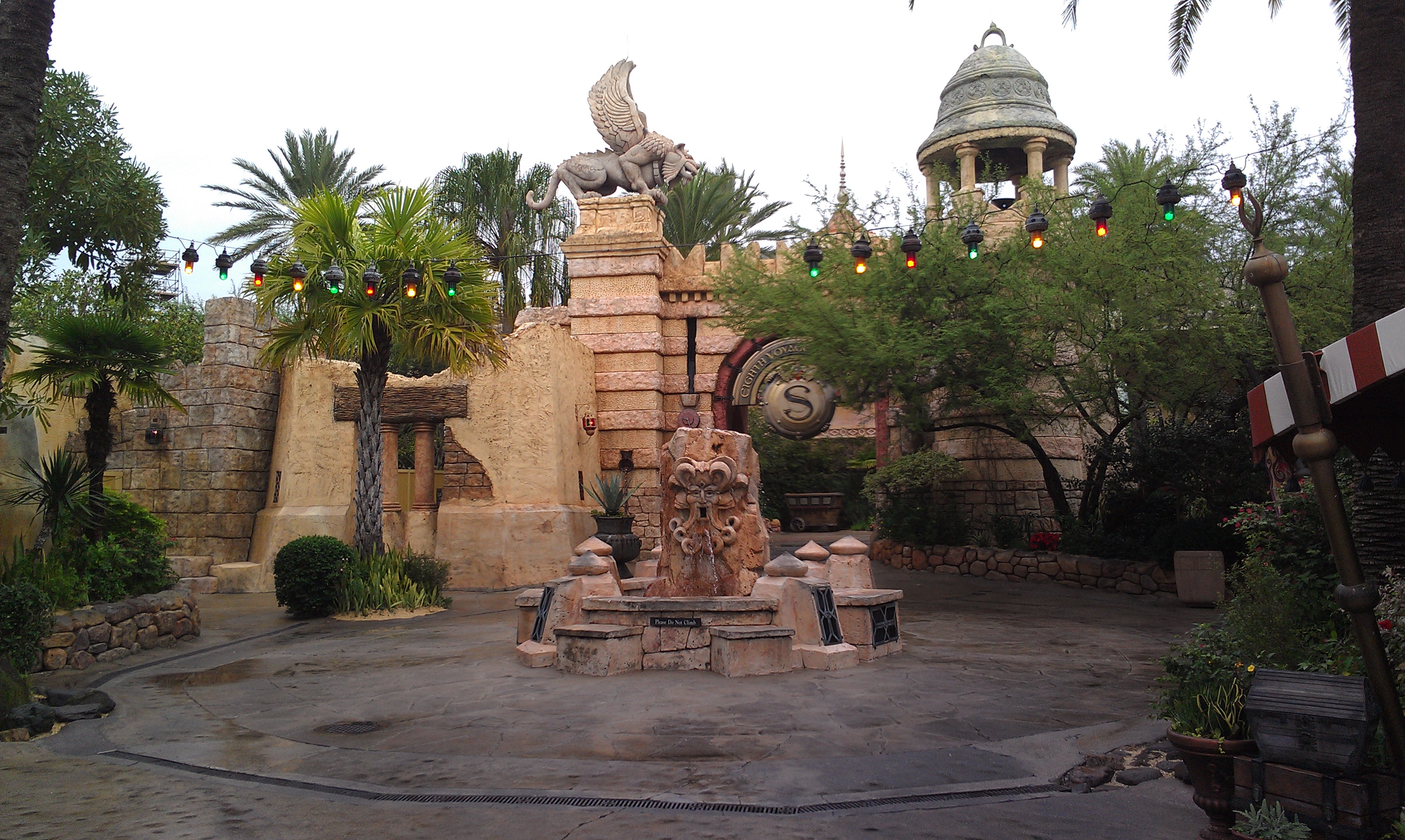 For the Eighth Voyage of Sindbad, a mischievous water fountain interacts and speaks with guests when they approach the entrance of the show. The stage is inside a cavern full of treasures and shipwrecks, with a lot of show action equipment, pyrotechnics, and advanced stunts. The premise is this: a voice gets our attention by blowing a loud concussion charge on stage. He explains that we are in the cavern of lost souls, the lair of the evil sorceress Miseria and, home of her most prized possession, the Sultan’s Heart. It is a priced ruby that provides endless power to its wielder.