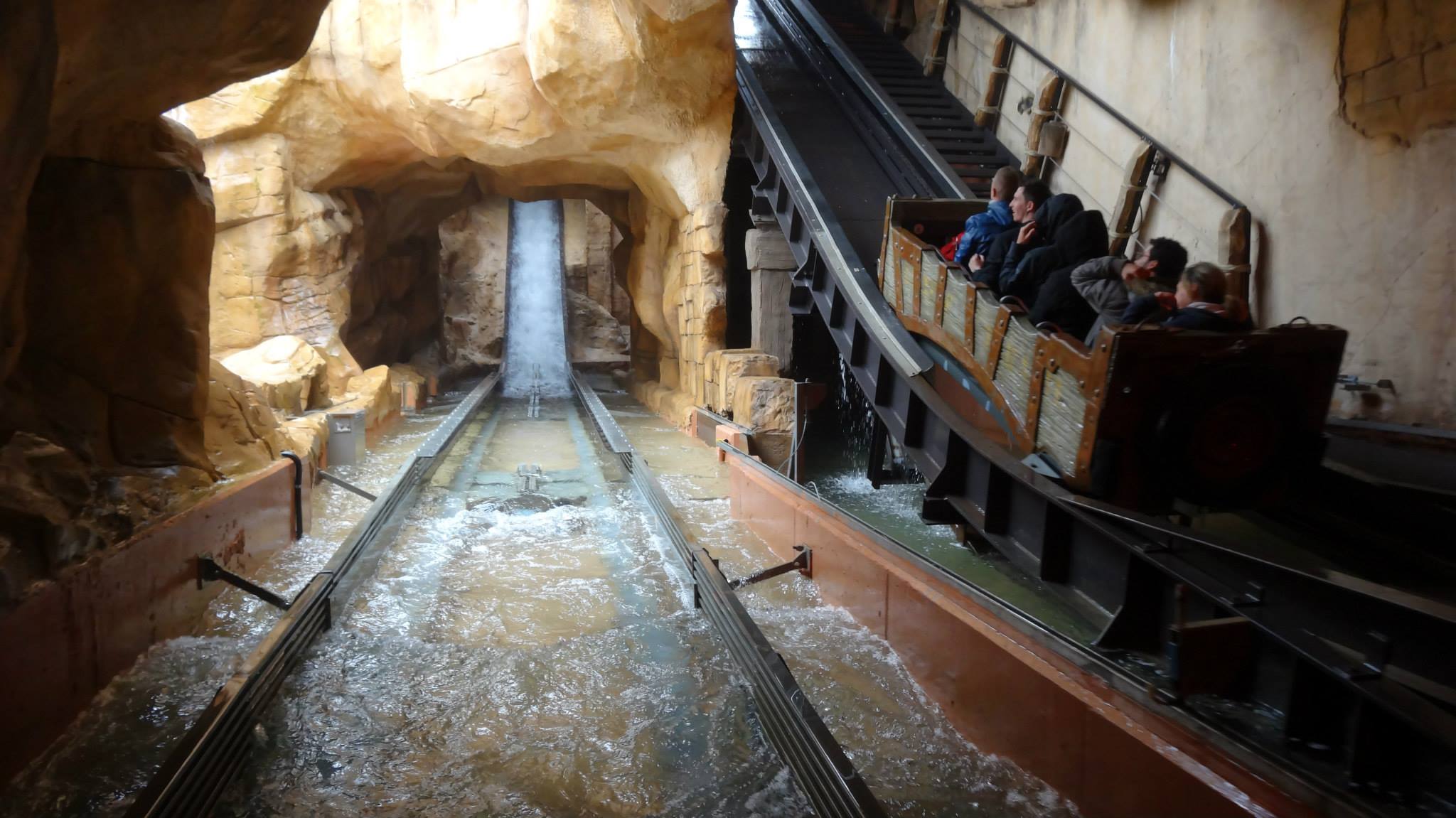 Valhalla has a beautiful rockwork facade with waterfalls. The boats leave the station and then enter the building through the skull’s mouth.