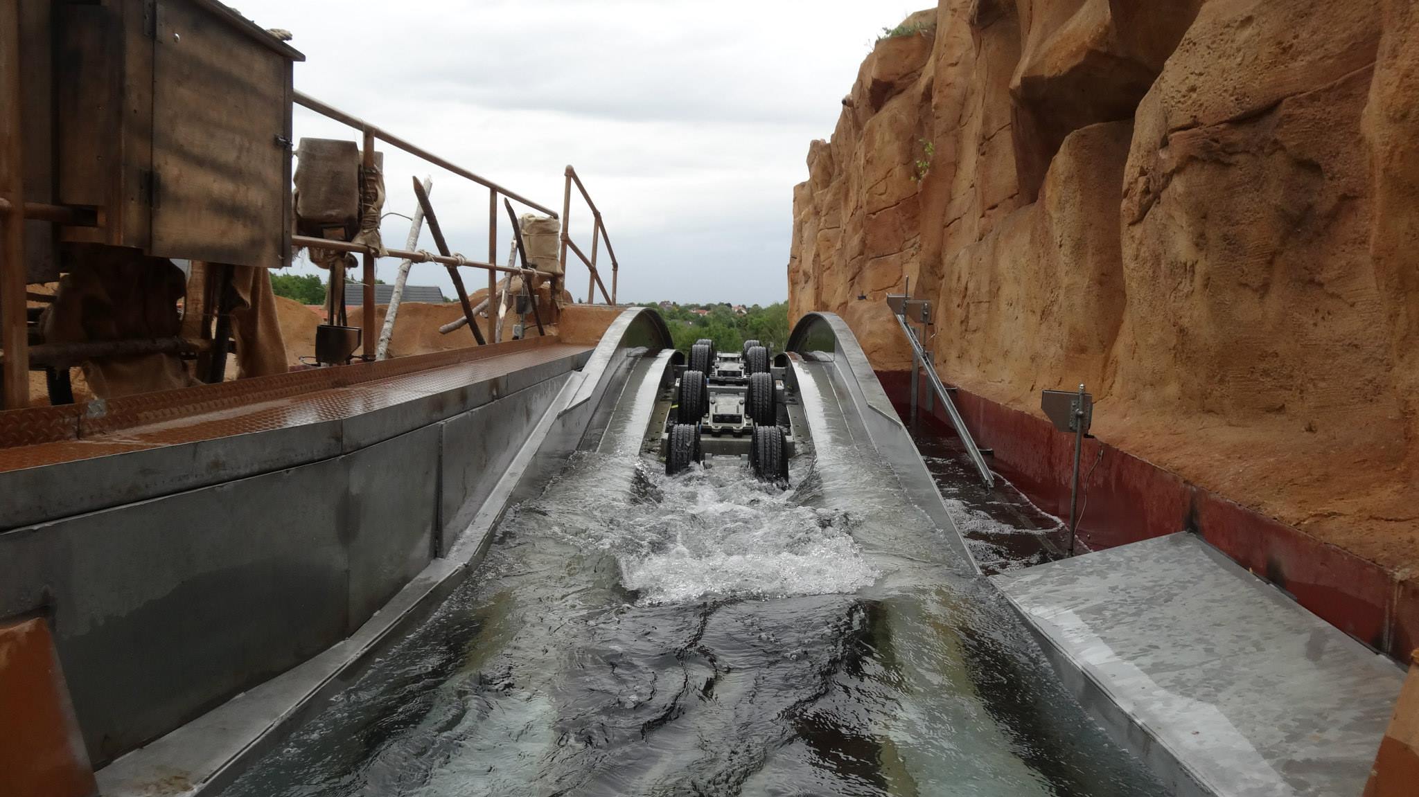 Due to the tight space requirements and size of the final drop, Intamin integrated Eddy-Current magnetic brakes on the airtime hill and spillway. You can see them in the middle of the flume.
