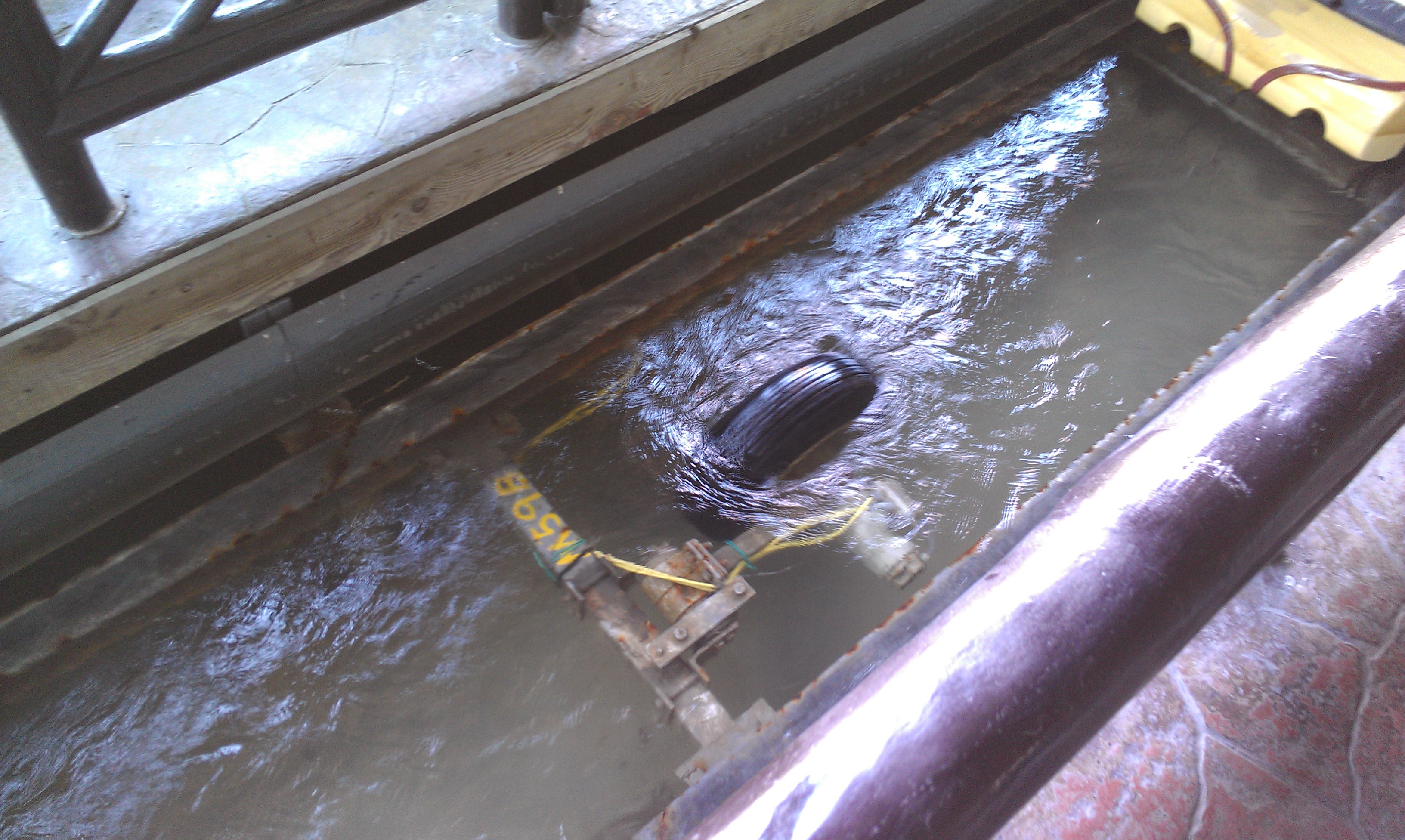 The second drop spillway chute. The sensors are inside the grey boxes mounted on top of the rails.