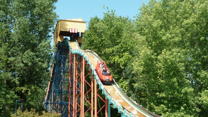 Intamin got into the log flume business in 1980 with the Wildwaterbaan at Bobbejaanland (Lichtaart, Belgium). Mechanically and style wise, it is closely related to the Arrow flumes, as it features a turntable in the station and rubber conveyor belts to take the boats up the lift hills. 1982 saw the opening of Hidrovertigo at Interama/Parque de la Ciudad in Buenos Aires, Argentina. This brand new park featured a lot of rides brokered and designed by Intamin and the Hidrovertigo log flume was remarkable for its unique set-up: both drops featured parallel lift hills and drops. Sadly, the attraction closed in 2003 when the park was shut down. The park reopened in 2007 for a short period, but the log flume never reopened.