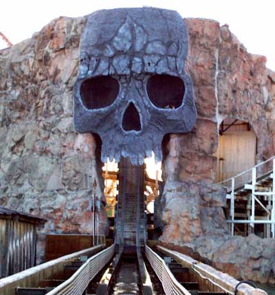 The ride was very well received by the public, but was always a challenge to maintain and operate for the park. Finally, in 2007, the park renovated the attraction and removed the first two turntables. This meant that the whole attraction would navigate forward and this simplified the ride a lot. The last turntable was retained simply because it was necessary to move the train from the lift to the drop. At the same time, the park renamed it “Skull Mountain”. It finally closed down on July 10th 2011 and was replaced in 2012 by a Bollinger & Mabillard Stand-Up Coaster called Apocalypse: The Ride. The giant skull and part of the second lift were retained as theming elements for the new ride that came from Six Flags Great America (Gurnee, IL).