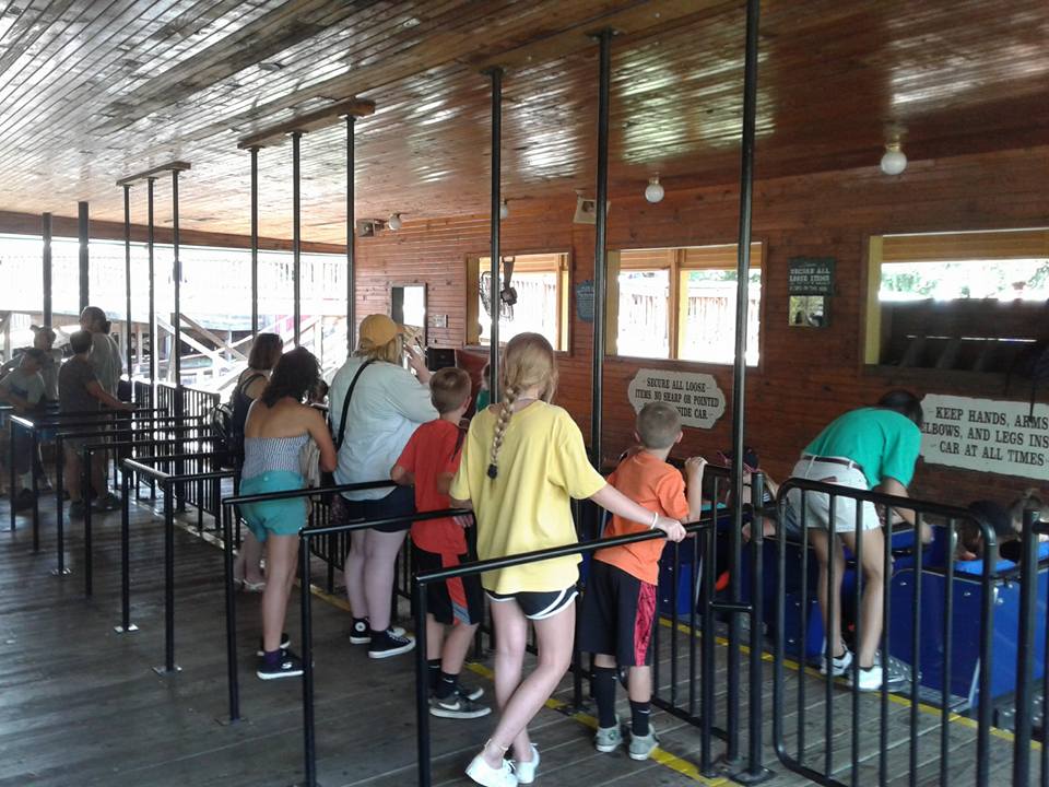 A sliding transfer track was constructed with the maintenance track behind the operator panel and a wall on the opposite side of the station. The original lap bars were retained, a single pivoting lap bar per row, with no seat divider in the train. In Missouri, the ride used separate loading and unloading positions in the station, with the transfer track on the opposite side of the guest area. This was the traditional way to build stations. Still, that method fell out of favor due to the extra staff it required and the very physical form of transferring trains. Staff had to push the station track under the station running board to get the transfer track aligned with the rest of the path.