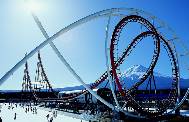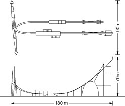 For the new roller coaster at Fuji-Q, Meisho kept the same general idea as their earlier Shuttle roller coaster: catch car to take a train facing forward up the spike before getting released and going through the course backward.  It would then have enough potential energy to return to the station.  Now, the plot of land they worked with was more of a rectangle than the long narrow strip of land commonly used at the time.  The land was near the large outdoor skating rink at the park’s front, making the new roller coaster a dramatic statement and enticed passersby.  In total, the ride footprint was 295 feet wide x 590.5 feet long, a massive surface for a shuttle roller coaster then.