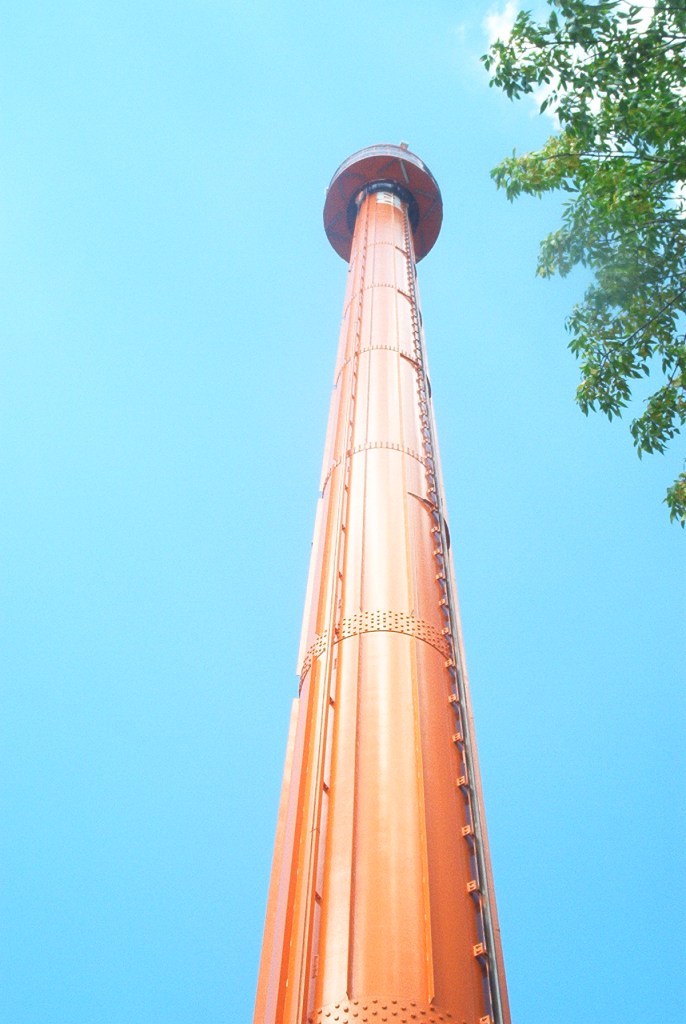 Fujikyu Highlands (now Fuji-Q Highland in Fujiyoshida, Japan) worked with Meisho/Sanoyas to build the world’s tallest roller coaster in 1983 as a new shuttle coaster.  Taking what Meisho had learned from their Loop The Loop design, Fuji-Q wanted to take guests to the next level: break the 60 meters (196.85 feet) barrier on a roller coaster.  Traditional observation towers from Von Roll and Willy Buhler, later sold by Intamin, routinely broke that threshold, in some cases reaching the 300 feet mark.  It was seen notably at Cedar Point in Sandusky, OH, Liseberg (Goteborg, Sweden), and Expo 67/La Ronde in Montreal, QC.  In all those installations, the tower reached 330-350 feet, including the top’s antenna.  For Space Spiral at Cedar Point and Spirale at La Ronde, the dual-level ride car reached the 285 feet mark.