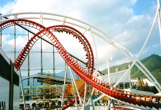 Accelerometers revealed a third-world record: the most intense roller coaster.  Riders felt an insane 6.5 G’s (6.5 times their weight) in the Pretzel Knot.  Where? Looking at where Meisho reinforced the track with additional track ties, the top sections at the top before it dives down toward the ground are a good hint as to where.  The bottom section and right half-loop portion also likely candidates for powerful forces.