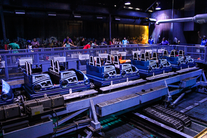 One incredible detail we discovered while looking at on-ride videos is the presence of a transfer track in the station building.  The reason for such a long station is not just for the tire brakes: a second train was present on the ride and could run alternately.  This was a brilliant move given the incredible forces the trains went through and stretched their life.  We assessed with videos and photos that the transfer track was managed this way: both tracks have brakes and drive tires mounted on them.  Before the park opened to guests, they slid either the left or right train on the track, and that was the one to run that day.  In the following video, you can see the empty track on the left side, indicating that the train was taken off the ride for annual maintenance.  https://youtu.be/h_ecR2dSbjo?t=102
