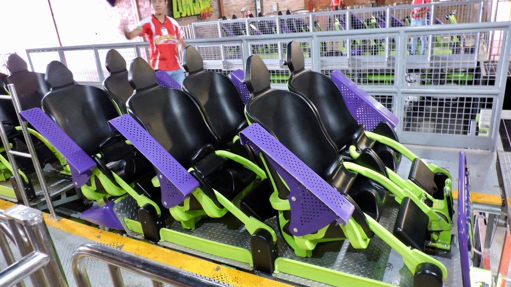 The boarding station looks like a spaceship from a science-fiction movie, tying in with the attraction name:  Moonsault Scramble/ムーンサルトスクランブル.  Guests boarded the seven-car train, with four passengers in two rows in each vehicle.  The small seats enclosed riders, and a padded shoulder restraint restrained them in.