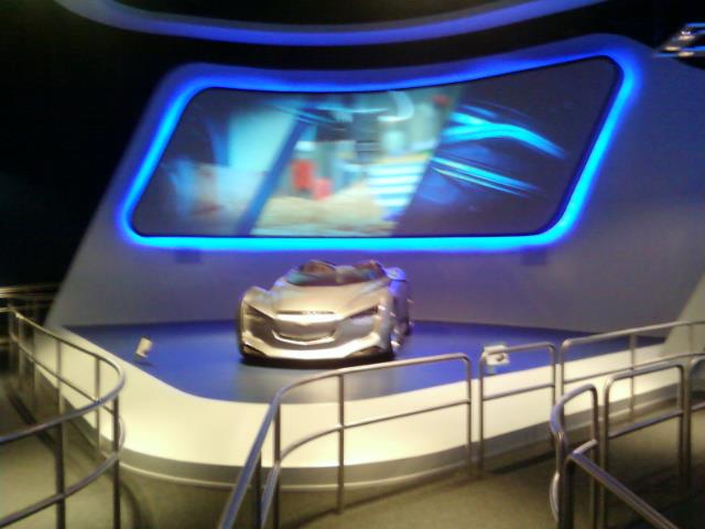 The attraction went away from its realistic and loud presentation to one very reminiscent of the TRON Legacy environment, which was a major departure from before. As a result, the queue was stripped of its test equipment and historic vehicles and went deeply into the “what if?” future of transportation using LED screens. The entrance has new sliding doors and a rounded shape, leading guests to a large hall with many concept vehicles and a sleek, clean design.