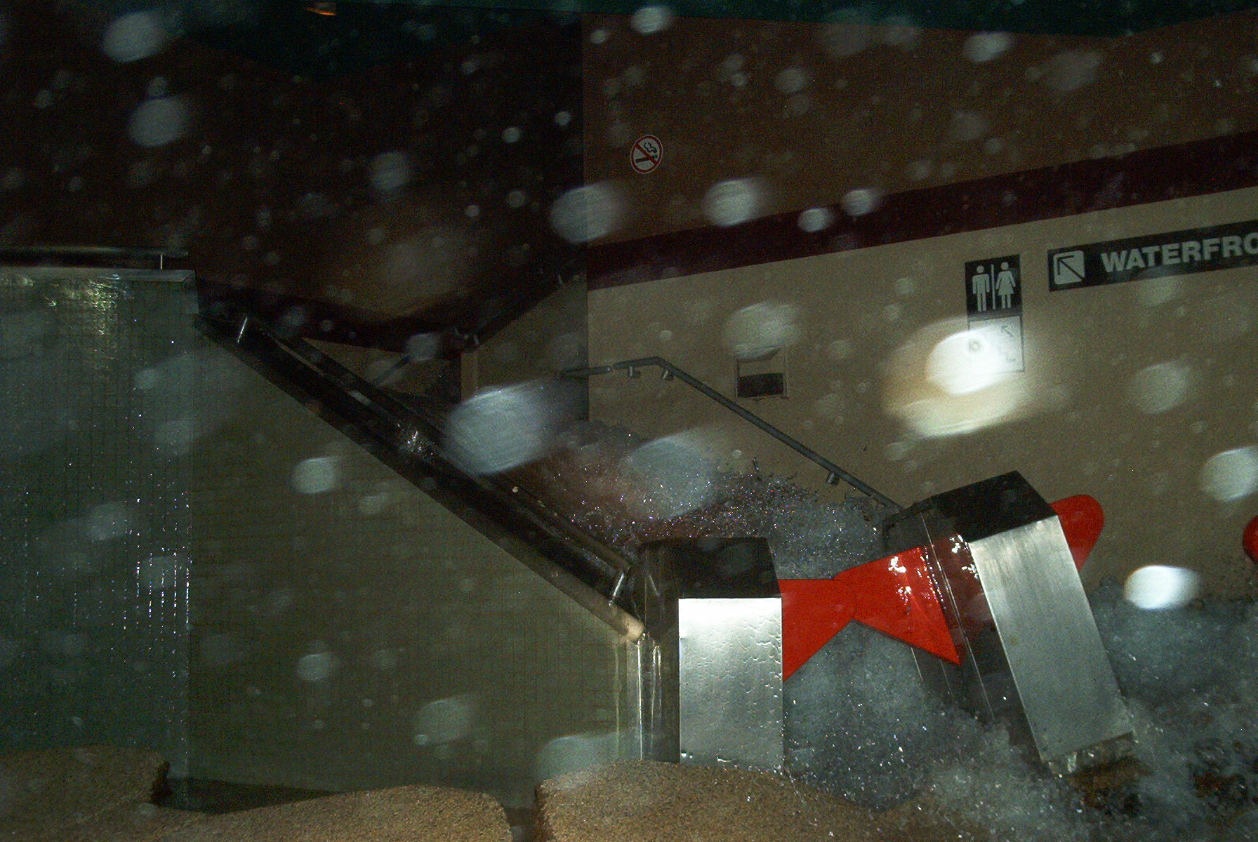 The water rushing down the stairs and pushing the turnstiles toward us.