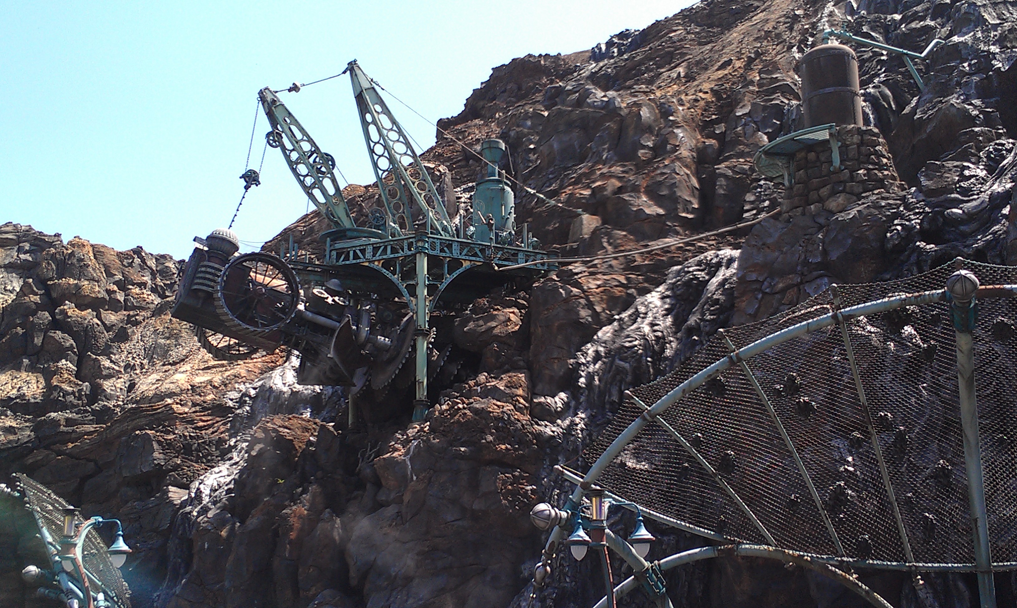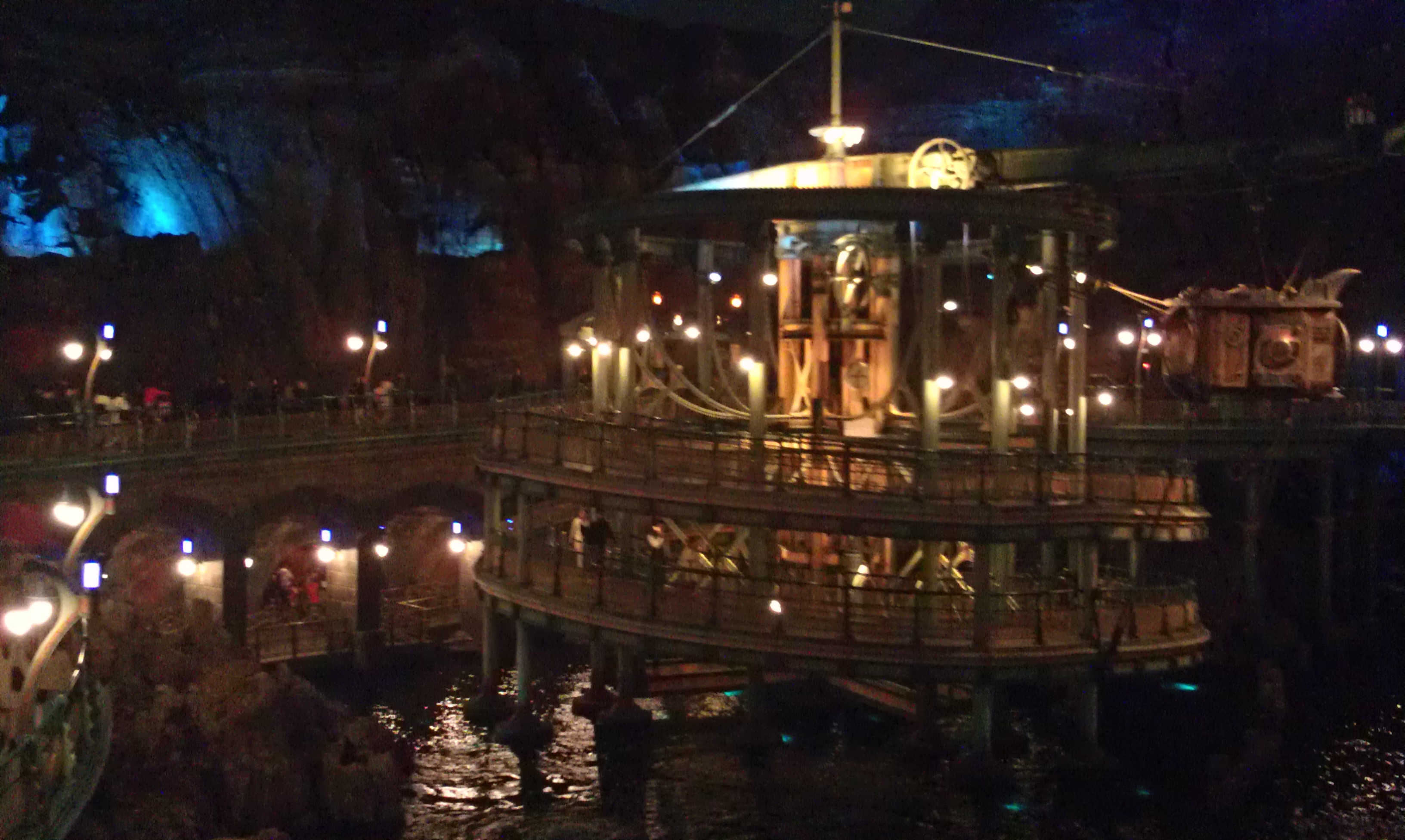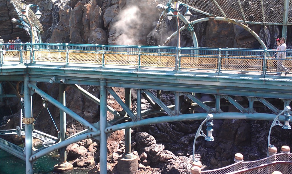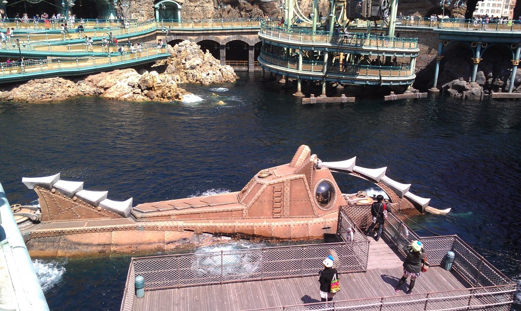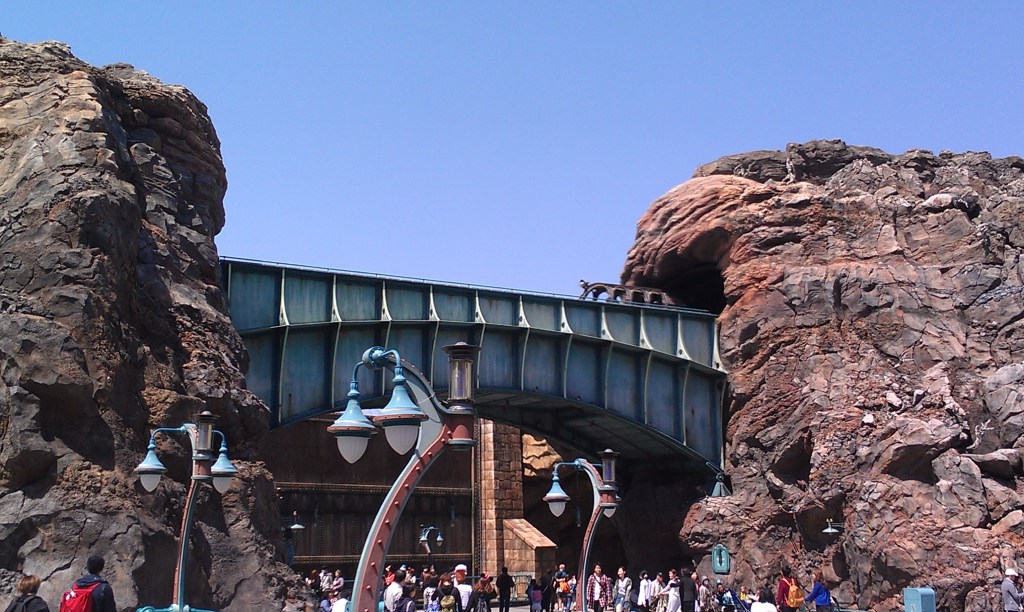 Mysterious Island is named after a Jules Verne novel and it is the setting for a central port of call in Tokyo DisneySea, around Mount Prometheus, the park icon. Transit Steamers pass by the island on the way to Mediterranean Harbor but do not stop as they go by the Nautilus. Captain Nemo’s presence, like in the novel the port is inspired by, is felt through the volcano’s caldera and in one of the attraction, 20 000 Leagues Under The Sea. This dry dark ride uses suspended ride vehicles with water-filled windows to give the illusion that we are deep under the ocean. This avoids all the maintenance challenges and costs that the attraction of the same name suffered from in Florida when it ran at Magic Kingdom as actual submerged submarines.
