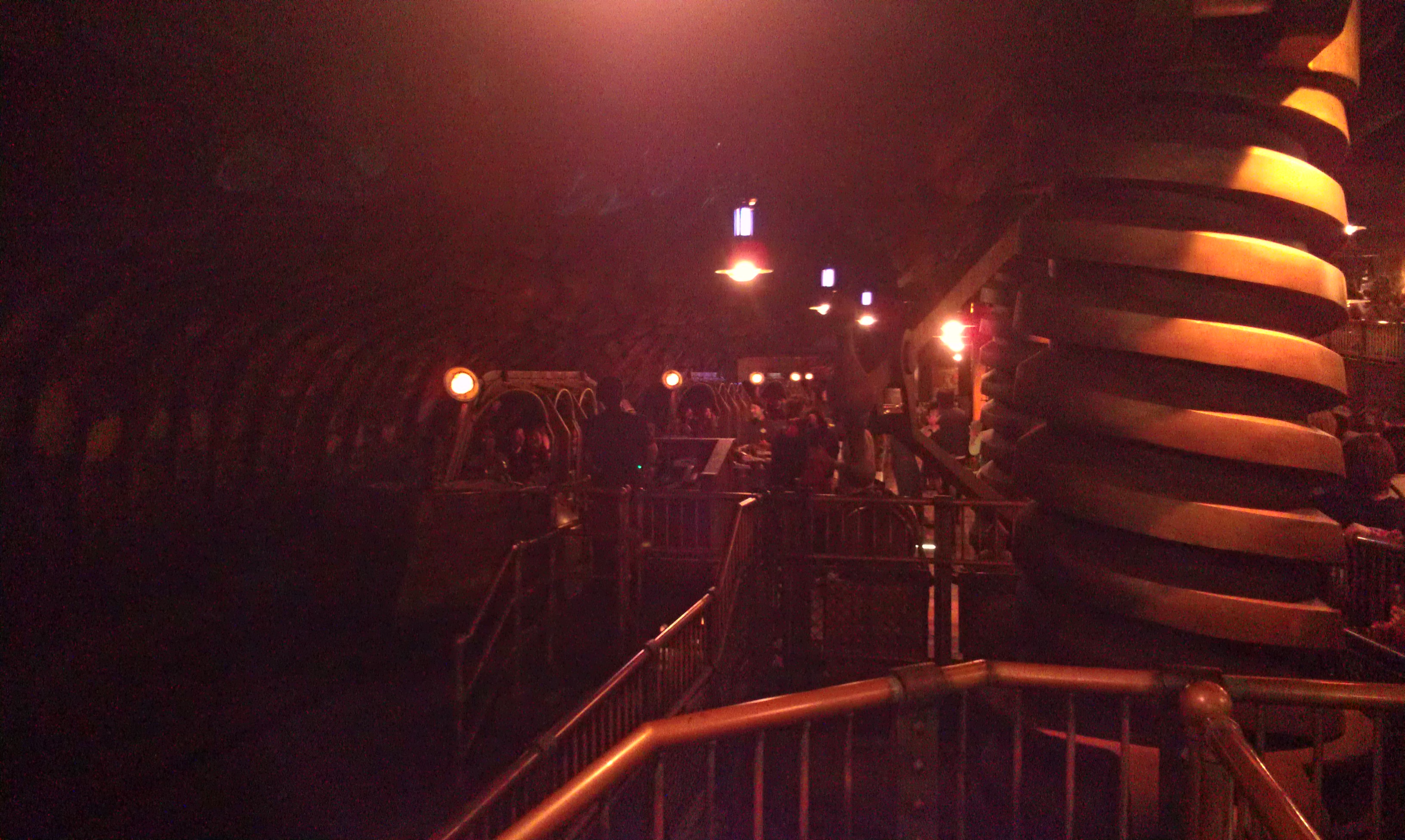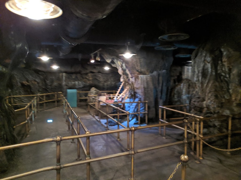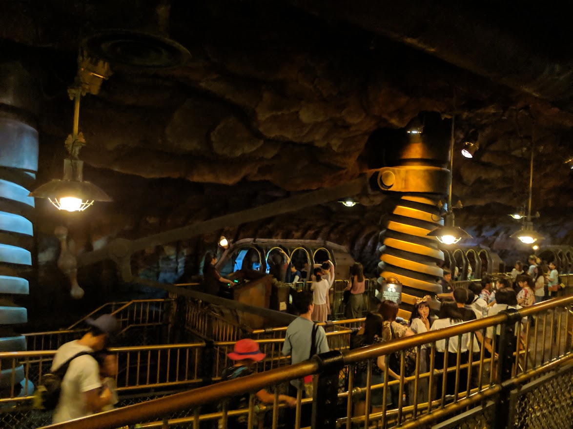 Large steam-powered bellows provide fresh air from the surface as ride vehicles regularly depart into the caves. As we go down in the queue, we pass by a communication station where someone in Japanese calls out that there are earthquakes in the safe path and it is not safe to proceed. Alas, the communication officer is away for tea, so the warning goes unheeded. Three ride cars are loaded at once in a dedicated loading area.