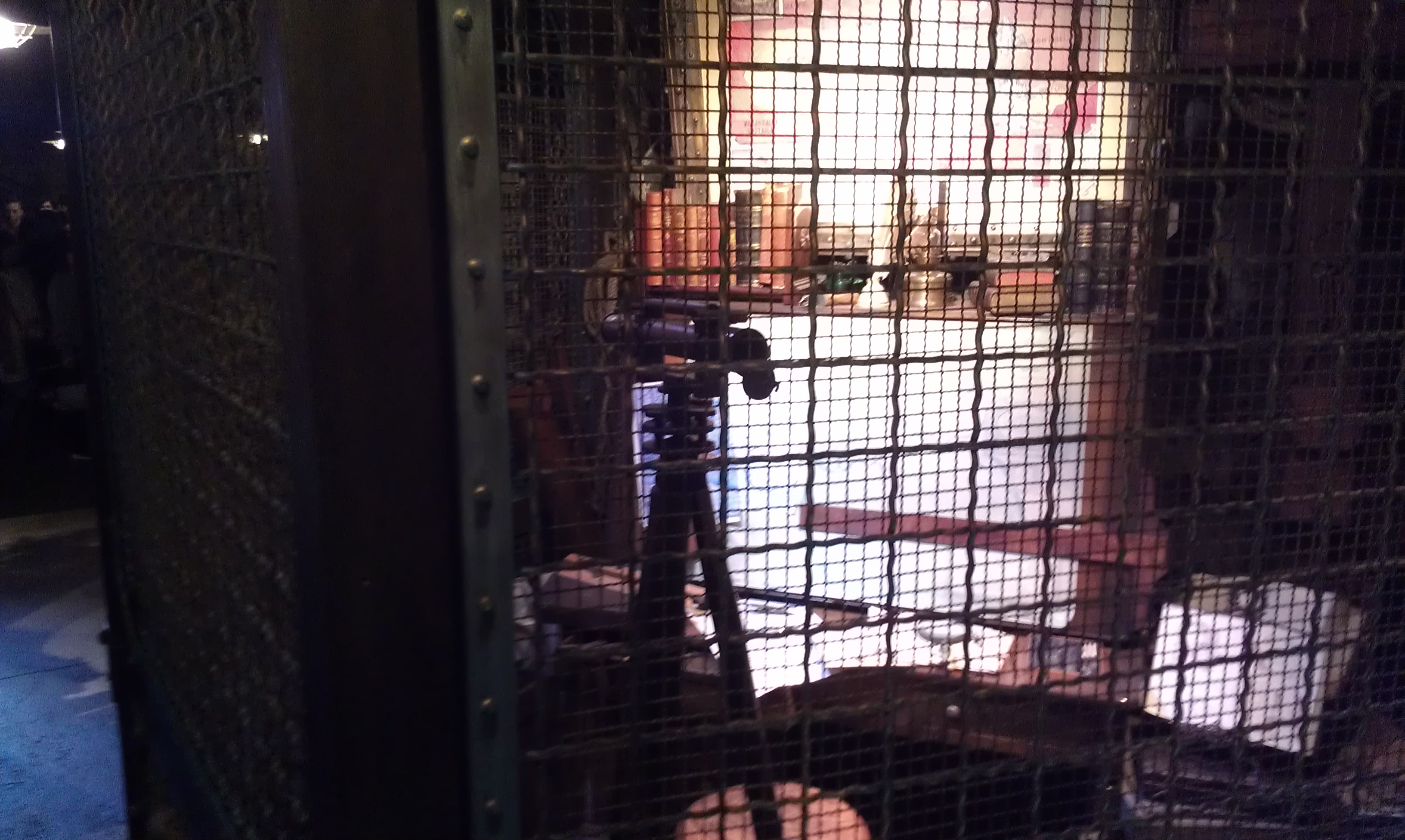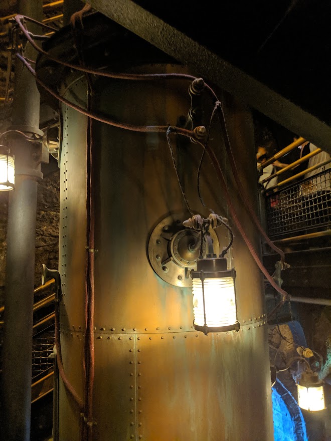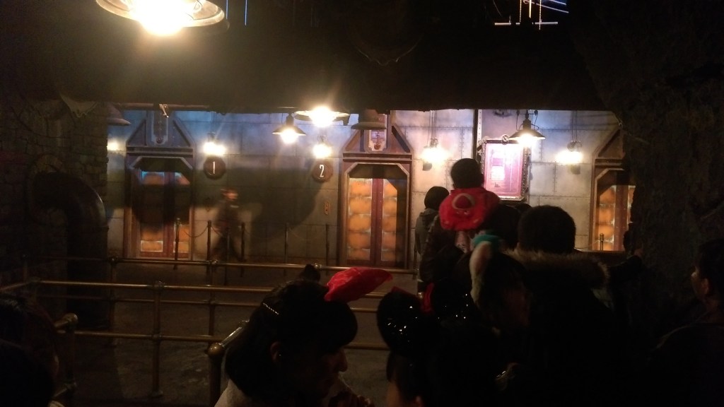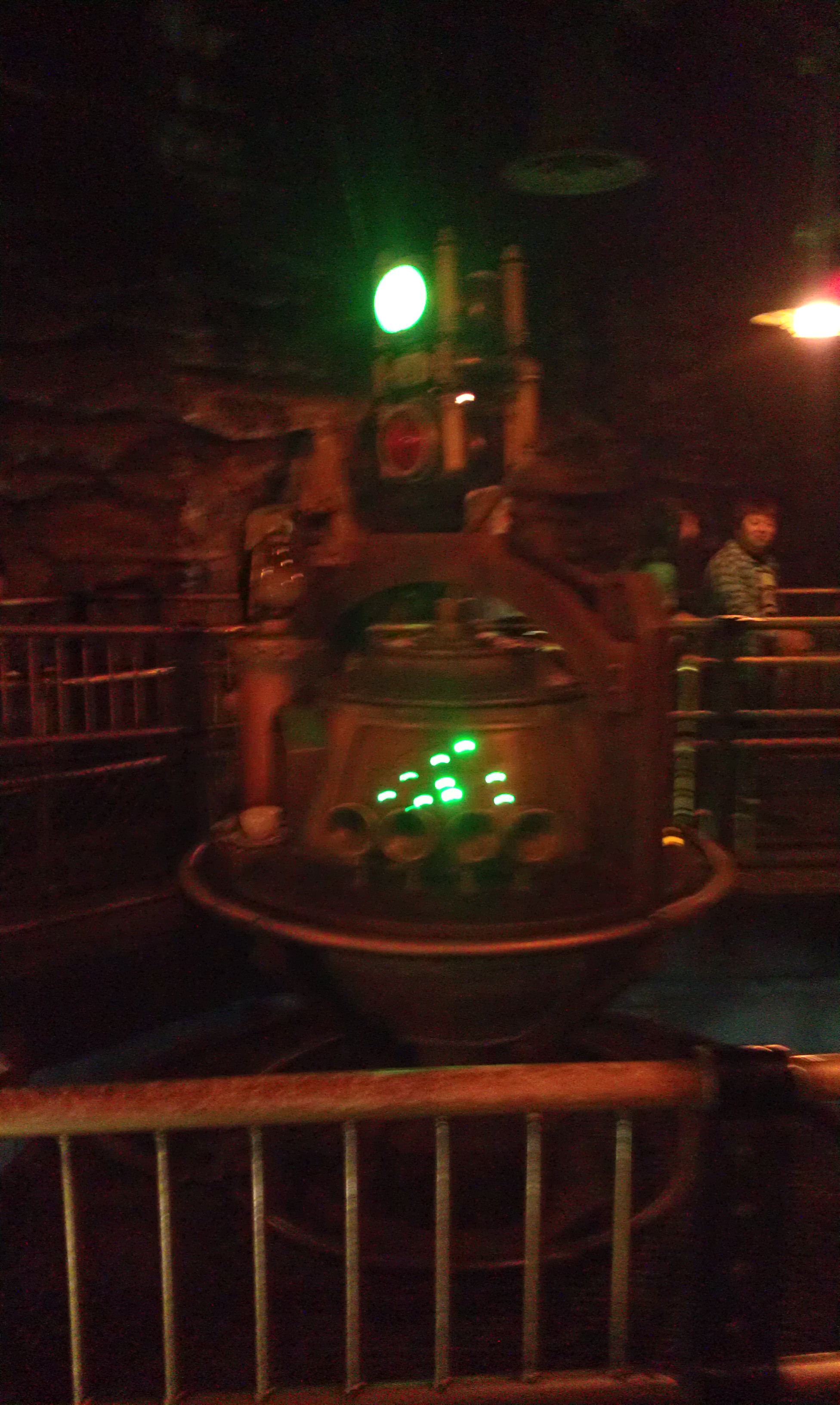 Large steam-powered bellows provide fresh air from the surface as ride vehicles regularly depart into the caves. As we go down in the queue, we pass by a communication station where someone in Japanese calls out that there are earthquakes in the safe path and it is not safe to proceed. Alas, the communication officer is away for tea, so the warning goes unheeded. Three ride cars are loaded at once in a dedicated loading area.