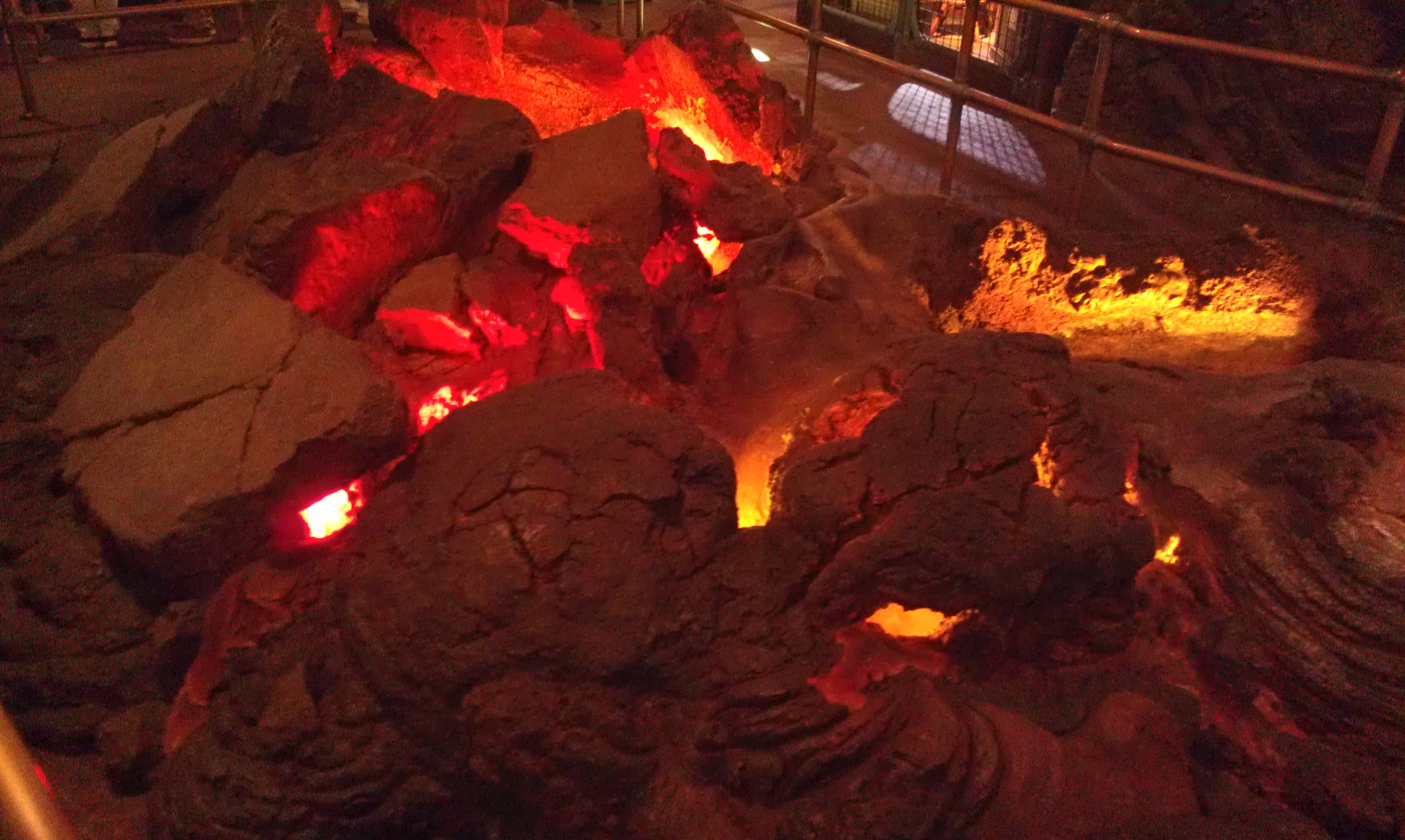 Exiting the forest, we see that the earthquakes mentioned in the queue have blocked the way ahead. As a crew member frantically calls us, the cars turn to the left instead, venturing into an uncharted area. Things heat up literally as the corridor is filled with steam as we see odd giant eggs, and the rock walls glow from the ambient heat. We then arrive at a massive indoor sea on our right. The music turns ominous as lightning strikes near us, using a tesla coil soon after.