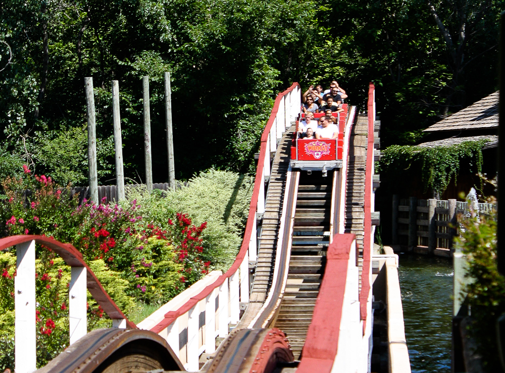 The new track replaced the original red track, and at the same time, the running boards were changed, both now a natural wood color. The pipes that acted as guard rails were replaced with red wooden panels as well. The tunnel was removed, and the two turns at that part of the turnaround were reprofiled, removing many sudden lateral forces. The new track also didn’t require side metal braces at the lift hill’s top, and those were taken off during the rebuild.