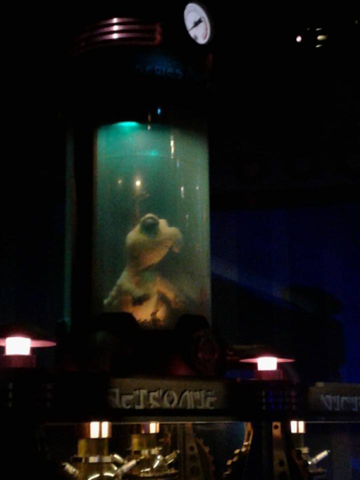 The attraction’s main theme takes us to the demonstration area, which serves as the second pre-show.  This is where the first of many changes between the 1994 preview attraction and definitive 1995 attraction occurred.  Originally, T.O.M. 2000 (Technorobotic Oratorical Mechanism serie 2000), Phil Hartman voiced the demonstration’s bumbling and friendly robotic host.  He was chatty and friendly to everyone, happy to see so many humanoids at once.  The demonstration consisted of a new teleportation machine, where beings were teleported from one tube to the other room after getting broken down into atoms and then reconstructed.  Skippy, a cute little six-legged white alien, was the guinea pig, and we saw him in the left tube.